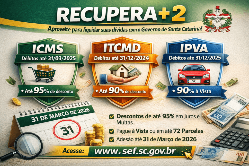A Lei nº 19.673, de 18 de dezembro de 2025, instituiu o Recupera+ 2, programa especial do Governo de Santa Catarina que permite a regularização de dívidas de ICMS, ITCMD e IPVA com descontos em juros e multas, além de possibilidade de parcelamento.